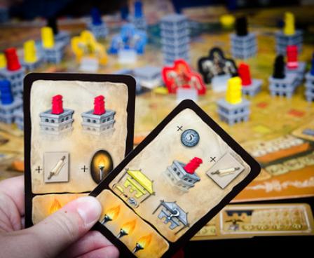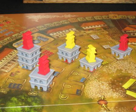 The game Porta Nigra (which translates as "black gate") is set in that place and time with the players taking on the roles of Roman architects working on the city gate of Porta Nigra. Each player commands a master builder, who moves around a circular track on the game board, enabling you to buy or build only where this master builder is located. Moving the master builder to farther locations along the track is expensive, so players must plan their movements and builds carefully. The number and type of actions that may be performed on your turn comes from cards in your personal draw deck.