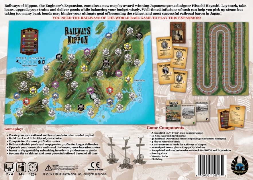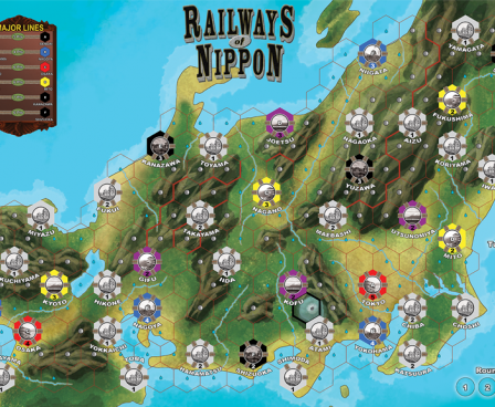 Railways of Nippon is a self-contained 2-4 player version of (but not a re-implementation because it also integrates with) Railways of the World with a new map of Japan designed by the Japanese game designer Hisashi Hayashi. The game takes place during Japan's rapid industrial growth during the Meiji era, where you take the role of one of the entrepreneurial railroad baron of that time.