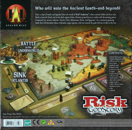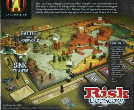 Risk Godstorm uses the basic combat elements of classic Risk but alters many other elements. The game is played on an ancient map of the world that focuses on Europe and Northern Africa. Atlantis is also present and highly desirable however a chaotic event can see the fabled city sink into oblivion, taking all the forces present there with it.