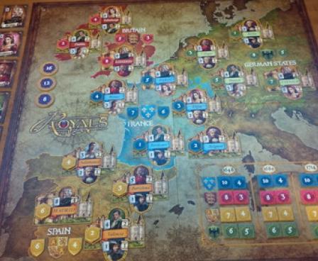In Royals, players take on the roles of the great noble houses of the 17th century, fighting for supremacy in Europe at that time. With the help of the right country cards, they occupy influential positions and obtain bonuses for this in the form of victory points. The higher the rank of the title associated with the position, the more country cards required. Already-occupied positions can be contested by playing intrigue cards.