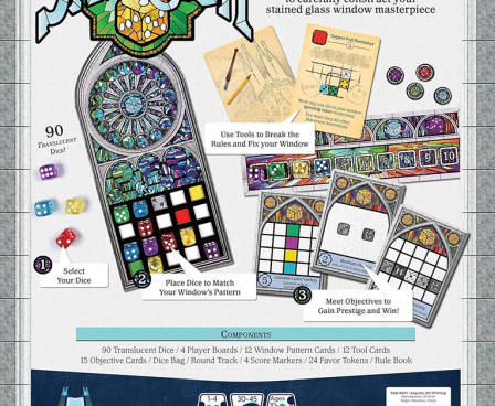In more detail, each player builds a stained glass window by building up a grid of dice on their player board. Each board has some restrictions on which color or shade (value) of die can be placed there. Dice of the same shade or color may never be placed next to each other. Dice are drafted in player order, with the start player rotating each round, snaking back around after the last player drafts two dice. Scoring is variable per game based on achieving various patterns and varieties of placement...as well as bonus points for dark shades of a particular hidden goal color.