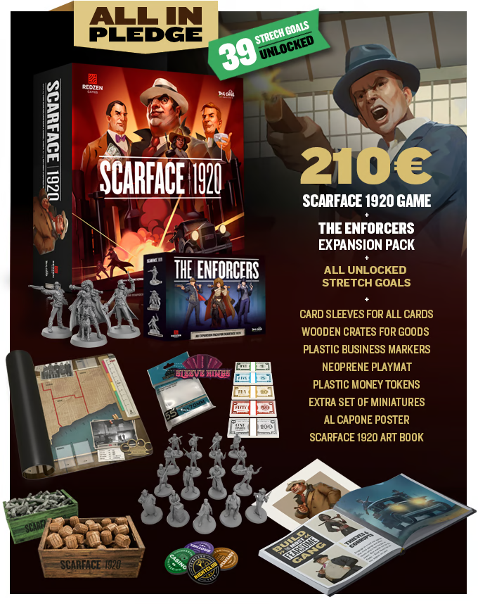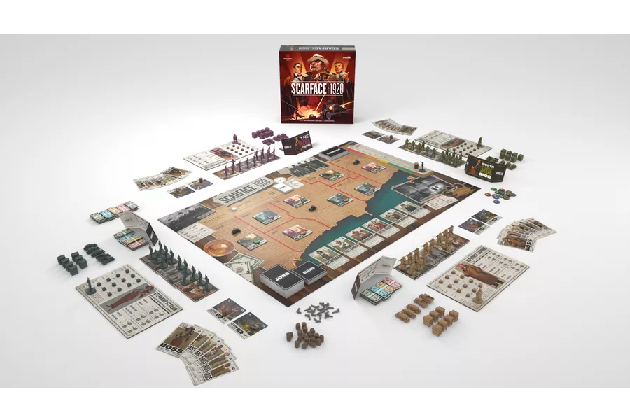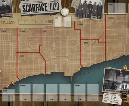 Scarface 1920 blends worker placement with deck-building mechanics in a game where you will have to recruit new associates, break new deals, fill the streets of Chicago with your thugs, enhance your headquarters —and do some dirty jobs along the way.