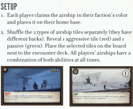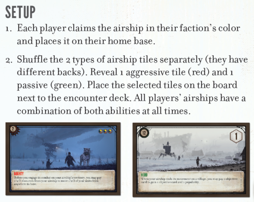 '' Airships: (1 miniature per faction; 16 tiles) An airship is a new type of unit that is distinctly different from characters, mechs, and workers. Unlike those units, airships never control territories. Airships are moved via a Move action, and rivers and lakes do not constrain their movement. Each airship has two randomly combined abilities (1 aggressive and 1 passive ability; same combo for all players).