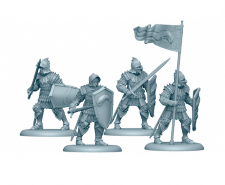 The A Song of Ice and Fire: Tabletop Miniatures Game Tully Sworn Shields unit box gives House Stark players a bulwark on the battlefield. Sworn Shields can utilize their Shieldwall order to negate hits to their front facing, dulling an enemy charge or subsequent attacks against them. Meanwhile, their trusty longswords will show that this unit isn’t entirely defensive in nature. The set includes 12 miniatures in four different sculpts, along with the unit’s stat card and movement tray.
