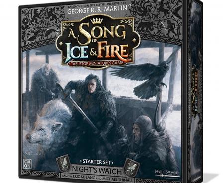 The Night's Watch Starter Set for the A Song of Ice and Fire: Tabletop Miniatures Game gives a player everything they need to start a Night's Watch force. It contains two units of Sworn Brothers, a unit of Veterans of the Watch, a unit of Ranger Trackers, plus many characters and unit attachments, such as Jon Snow, his Direwolf Ghost, and Jeor Mormont. It also has dice, tokens, terrain, and everything else required to start playing right out of the box.