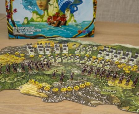 Spirit Island is a complex and thematic cooperative game about defending your island home from colonizing Invaders. Players are different spirits of the land, each with its own unique elemental powers. Every turn, players simultaneously choose which of their power cards to play, paying energy to do so. Using combinations of power cards that match a spirit's elemental affinities can grant free bonus effects. Faster powers take effect immediately, before the Invaders spread and ravage, but other magics are slower, requiring forethought and planning to use effectively. In the Spirit phase, spirits gain energy, and choose how / whether to Grow: to reclaim used power cards, to seek for new power, or to spread presence into new areas of the island.