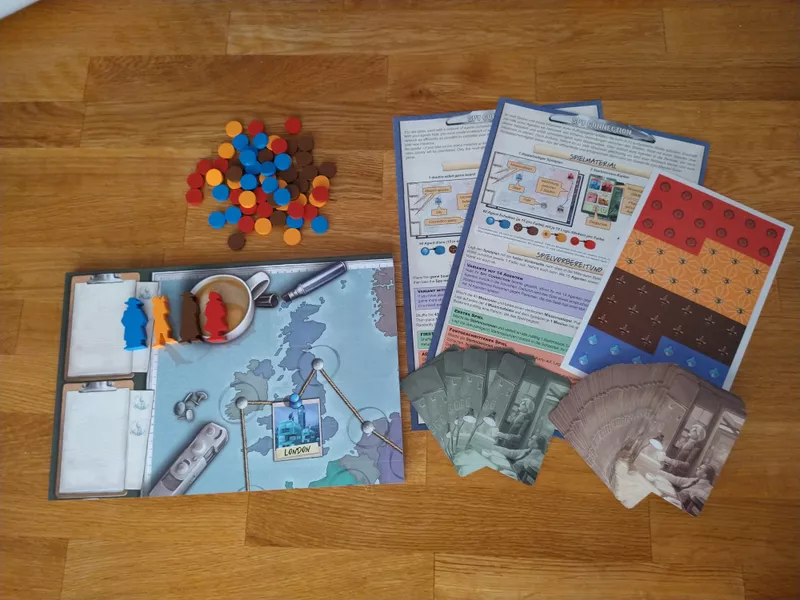In Spy Connection, which was originally announced as Web of Spies, players travel Europe to fulfil their missions as quickly as possible. To fulfil mission cards, players have to build a route between all shown locations. While they are allowed to use their established network to fulfil future missions, their network is of limited size: eventually, to expand in one direction they will have to remove markers elsewhere, thus changing their network throughout the game to meet the current requirements. Whoever manages to fulfil seven missions first wins.