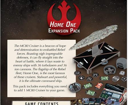 Featuring one large-size, pre-painted miniature MC80 star cruiser, two ship cards, three command dials, and fourteen upgrades, the Home One Expansion Pack gives the Rebel Alliance a ship that can trade blow for blow with nearly any Imperial vessel.