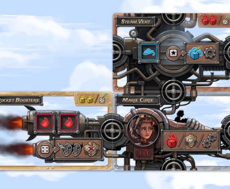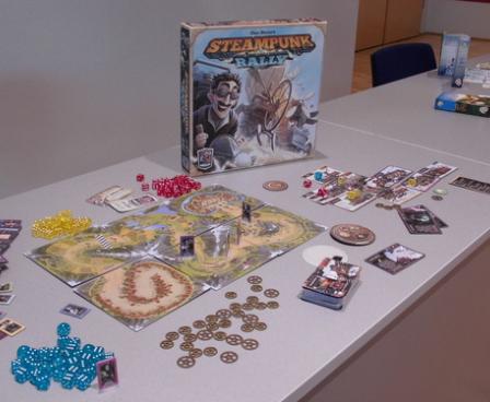 Steampunk Rally is a strategy game that incorporates steampunk as more than just a bit of chrome. Using a unique dice-placement mechanism, players take on the roles of famous inventors from the turn of the last century like Nikola Tesla and Marie Curie, constructing fantastical contraptions that make use of steam, heat and electricity in an attempt to win a no-holds-barred race through the Swiss alps.
