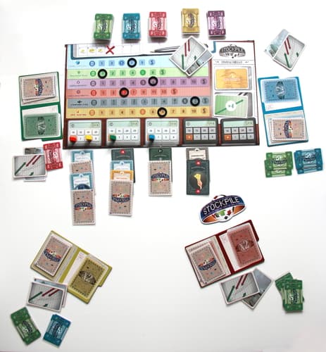 Stockpile is an economic board game that combines the traditional stockholding strategy of buy low, sell high with several additional mechanisms to create a fast-paced, engaging and interactive experience.