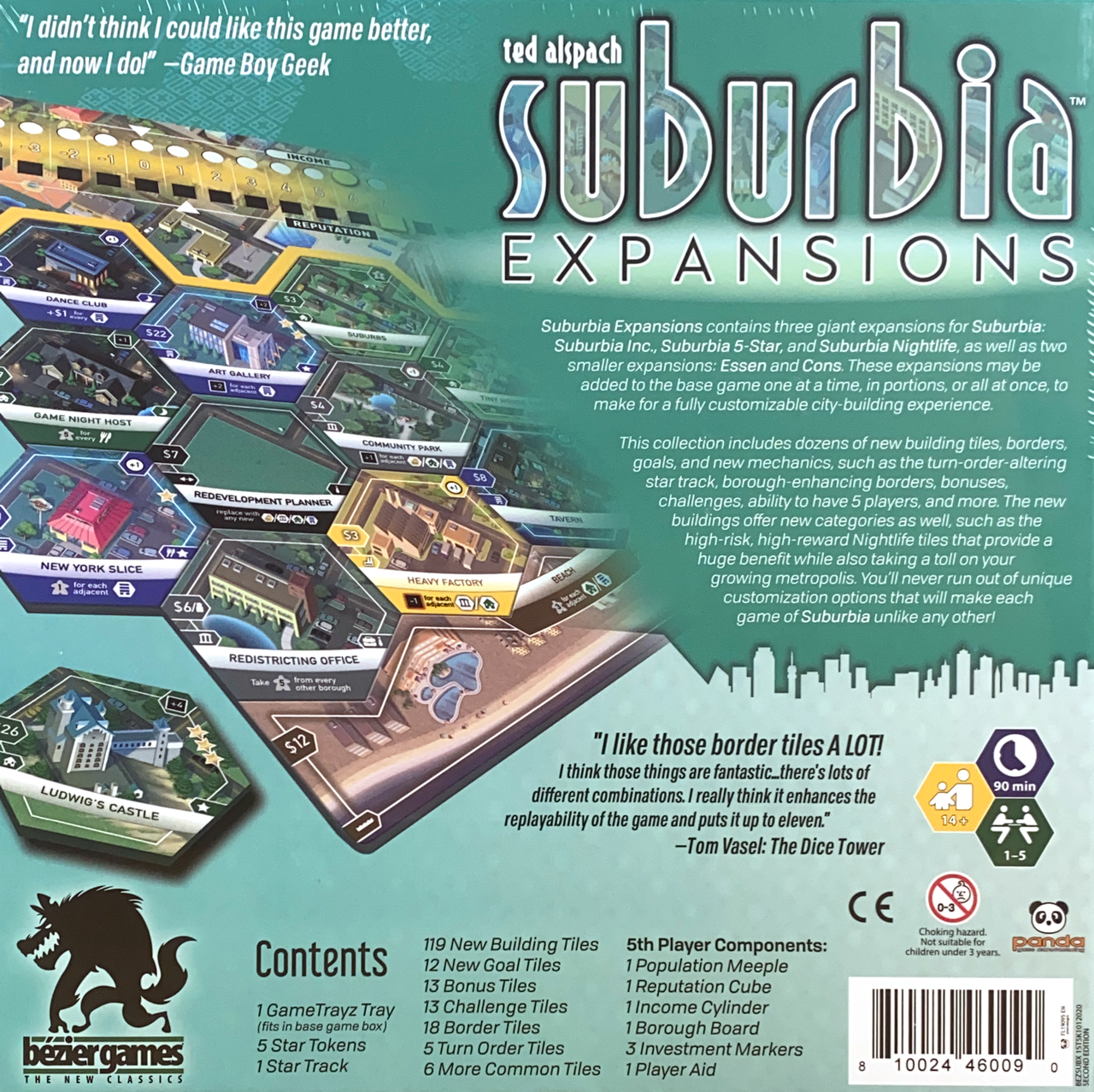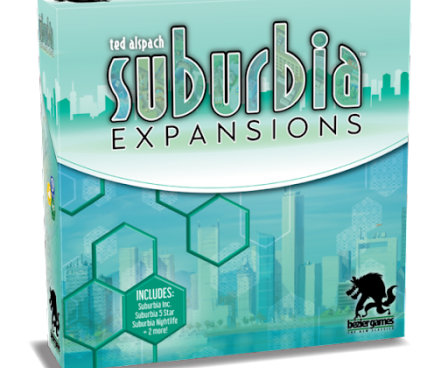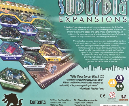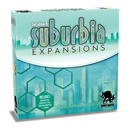 Suburbia: Expansions contains three large expansions for Suburbia that were originally released independently — Suburbia Inc., Suburbia 5★, and Suburbia Nightlife — as well as two smaller expansions: Essen and Cons. These expansions can be used with Suburbia one at a time, in any mixture, or all at once!