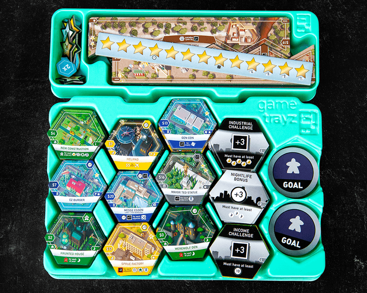 This box is organized with GameTrayz organizers and made to be combined with the second edition of Suburbia, which has larger tiles than in the original release.