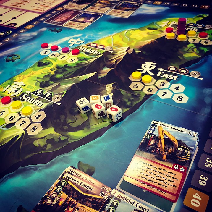 Taiwan is a resource management city-building game that requires area control and precise timing. Players run construction companies in Taiwan and manage their resources to build the right combination of structures at the right times and places to score the most points and win the game!