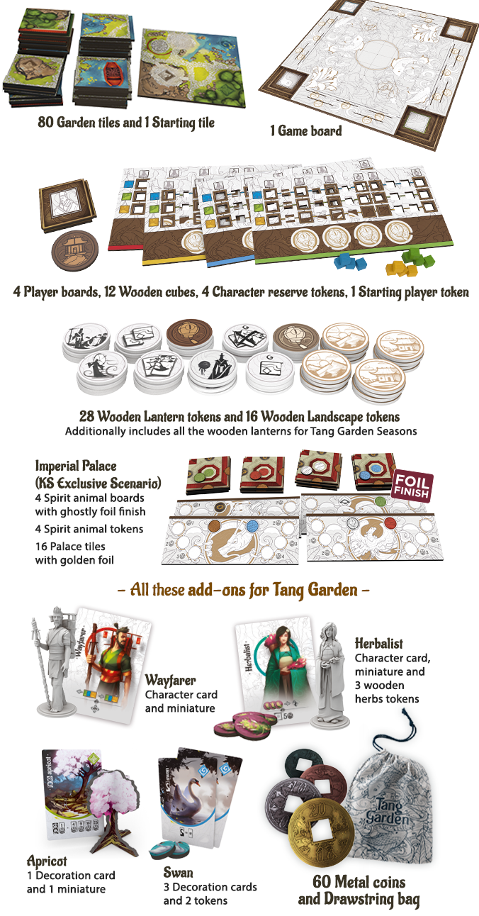 The Tang dynasty was considered the first golden age of the classical and now iconic Chinese gardens. Emperor Xuanzong built the magnificent imperial Garden of the Majestic Clear Lake as an homage of life itself and from where he ruled. Players will act as Imperial Garden Designers and they will be called to build the most incredible garden while balancing the elements of Nature.