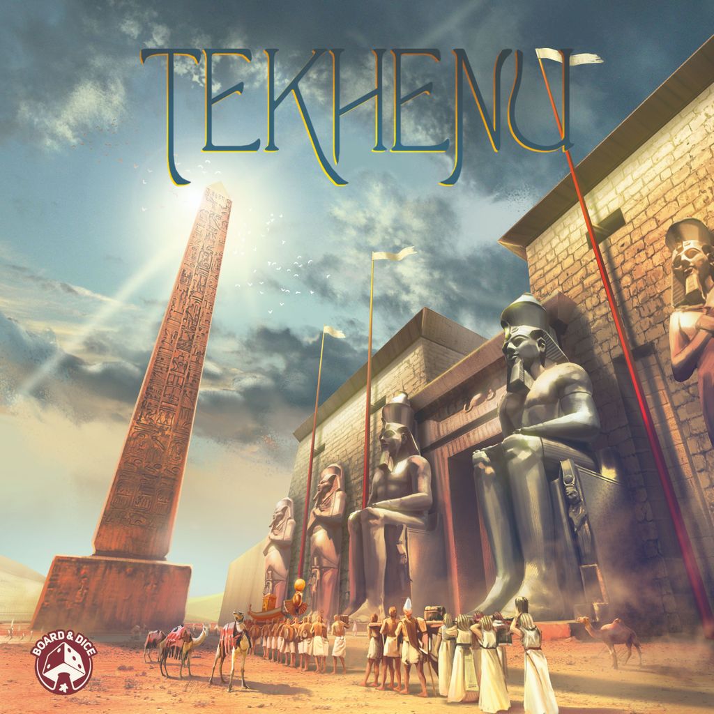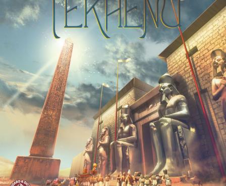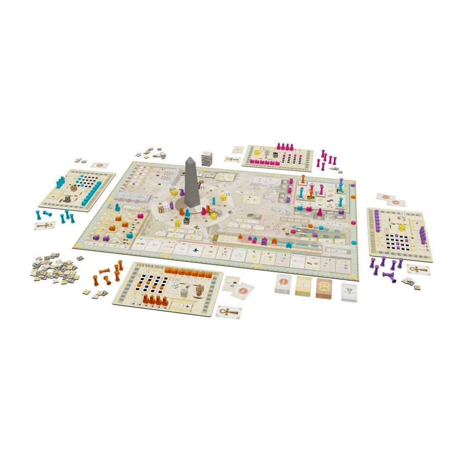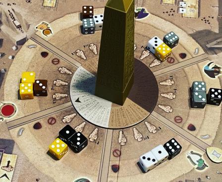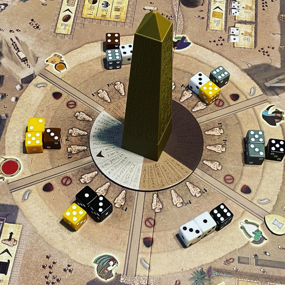 The game board in Tekhenu: Obelisk of the Sun is divided into six sections, each associated with an Egyptian god: Horus, Ra, Hathor, Bastet, Thoth, and Osiris. In the center stands an impressive obelisk (Tekhenu) that casts its shadow onto different parts of the board. As a result, the area around the obelisk is divided into sunny, shaded, and dark sections, depending on how the obelisk casts its shadow at that particular moment. As the game progresses, the sun's rotation alters which sections are sunny, shaded, or dark.