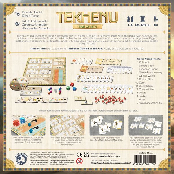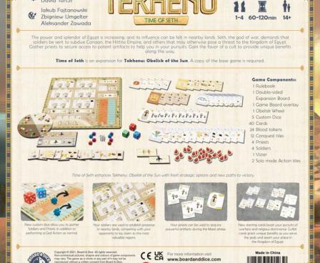 Tekhenu: Time of Seth adds new layers of interaction and new options to Tekhenu: Obelisk of the Sun. A new board opens up options of conquering neighboring lands to receive in-game benefits, as well as new scoring opportunities. New dice allow for mustering Soldiers and gathering priests. However, conquest comes with a price, as with more battles fought, balancing one's deeds becomes more complicated than before.