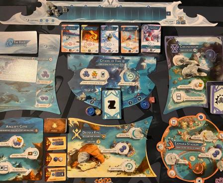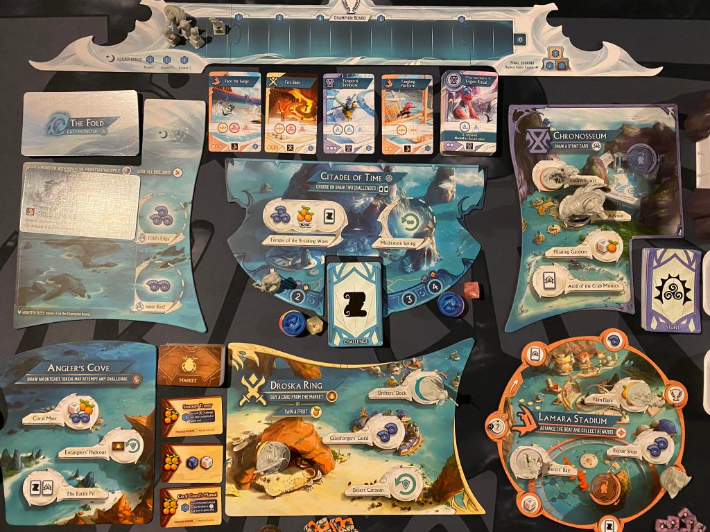 Each day you will send your hero to take actions on the different Locations and to undertake Challenges. Each action will gain you the resource or effect listed on the action space as well as the Location bonus. At the Arenas you may then attempt a Challenge that matches your Location, and at the Fold you may battle a monster. Completing Challenges and fighting monsters will advance your character in the four traits of Focus, Spirit, Resilience and Synergy.
