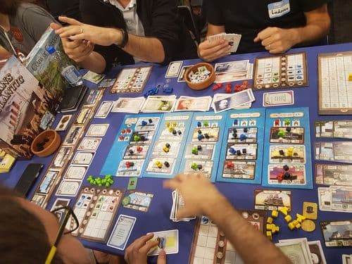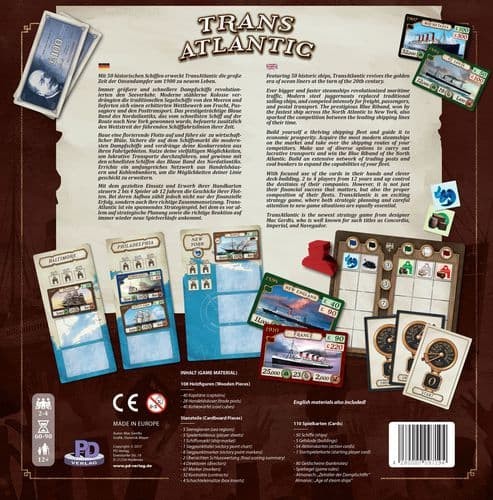 In Transatlantic, 2 to 4 players lead their own shipping companies, which transport freight, mail, and passengers around the globe. They purchase new steamships from the market, each of them historical with their individual technical data (tons, knots etc.). Competition is tough, especially in the North Atlantic where winning the "Blue Riband" is not only a matter of prestige, but may also be a profitable investment. In order to let a shipping company flourish, purchasing the best steamships is not enough, if one fails to acquire enough coal bunkers and trade posts as well.