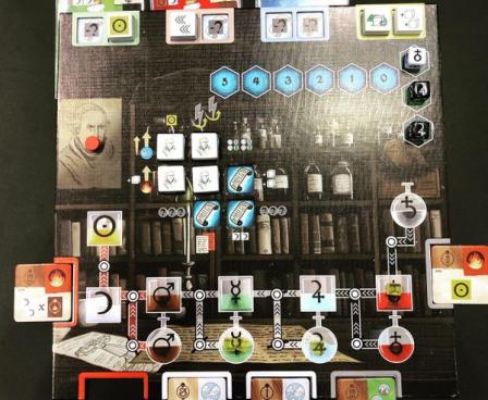 The game features custom dice, the sides of which represent alchemical materials. At the beginning of each round, the dice are rolled and grouped by their respective types. On your turn, you must either draft a new die or utilize the untapped potency of a previously drafted die. Based on the material associated with your chosen die, you will be able to collect certain essences in addition to the material to which the die is keyed. Additionally, the color of the die will determine which types of transmutations you can perform, refining raw materials and increasing your mastery of the elements.