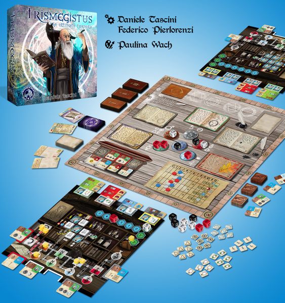 Trismegistus: The Ultimate Formula is played over three rounds during which you will draft exactly three dice. By expertly utilizing the potency of your drafted die, you will be able to transmute precious materials, collect alchemical essences, purchase and activate artifacts, and perform experiments that will progress you along four mastery tracks. You will also build a secret hand of publication cards which — together with the value of your experiments, the completed formulas of your Philosopher's Stone, and your collected gold — will determine your final score in victory points and, perhaps, make you the greatest alchemist, someone able to rival Hermes Trismegistus himself!