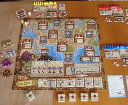 After five rounds, the game ends with players receiving victory points for arriving in Beijing, fulfilling the most orders, and having reached the cities on secret city cards that each player gets at the start of the game; these points are added to the VPs gained during the game.