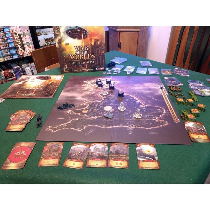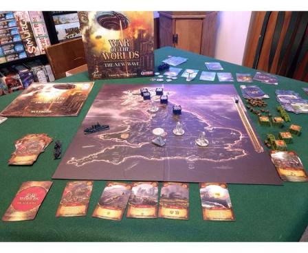 War of the Worlds: The New Wave is an asymmetrical deck-building game with a playing board for two players. The game events unfold several years after the original "War of the Worlds" story by H.G. Wells.