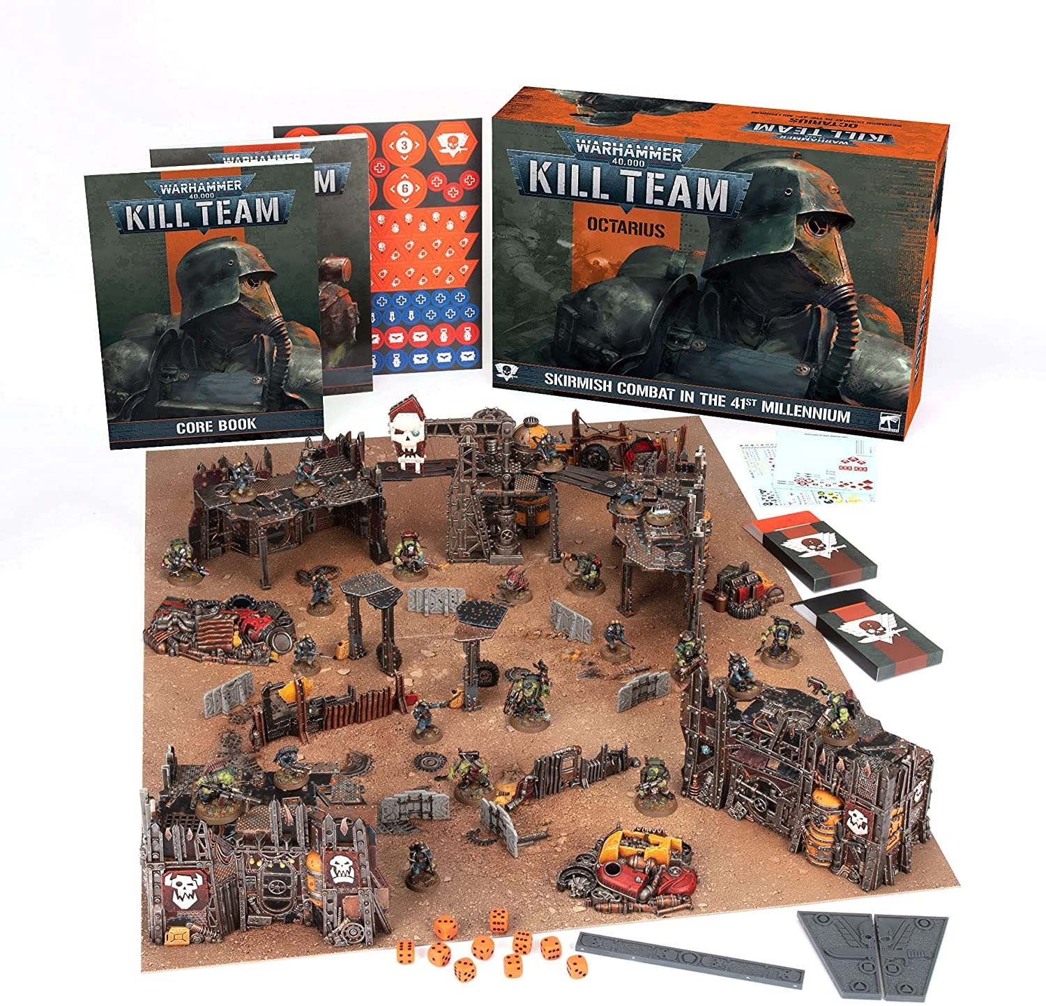 A rogue Inquisitor’s gambit has failed. Hordes of Orks and Tyranids, set against each other in hope of mutual destruction, only grew stronger and now threaten to spill out of the Octarius sector into surrounding space. Only the desperate actions of highly specialised kill teams keeps their rampage in check, but they are not the only ones skulking through the shadows. Elite operatives clash in close confines, engaging in furious firefights and deadly duels, and the fate of billions hangs in the balance. The new edition of Warhammer 40,000: Kill Team has been redesigned from the ground up as the greatest tabletop skirmish experience yet, and Kill Team: Octarius is the perfect place to start your campaign of clandestine missions. This incredible boxed set includes two full kill teams – Veteran Guardsmen of the Death Korps of Krieg and cunning Ork Kommandos – alongside all the rules, terrain, and accessories you need to start playing.