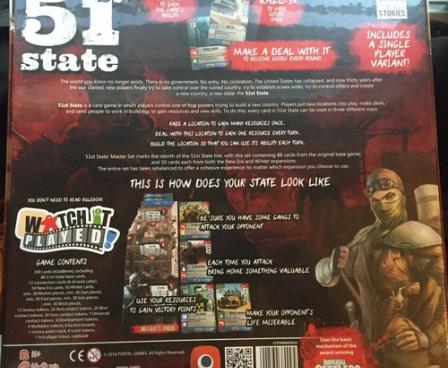 51st State: Master Set marks the rebirth of the 51st State line, with this set containing 88 cards from the original base game, and 50 cards each from both the New Era and Winter expansions; one of these expansions can be mixed with the cards of the base game, but not both at the same time. The entire set has been rebalanced to offer a cohesive experience no matter which expansion you choose to use.