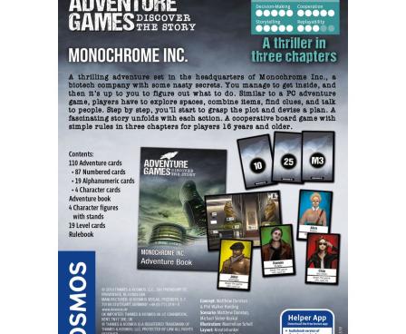 In Monochrome Inc., players have been instructed to break into the research building named in the game's title, and once they get inside this tower's mirrored windows, they are left on their own. What they find there, what conclusions they draw from these items, and how this nerve-wracking story ends is entirely in their hands. Only by co-ordinating their team will they avoid potential pitfalls, carry out their mission, and solve the mystery of this building.