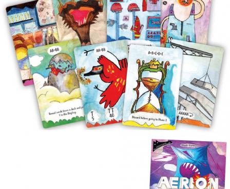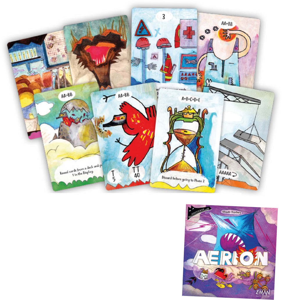 In Aerion, a solo/co-operative game for 1-2 players, you must find the best blueprints, acquire the finest construction materials, and recruit the best crew. Discarding cards can adjust your die rolls, but be careful not to exhaust your resources! Can you build the best fleet?
