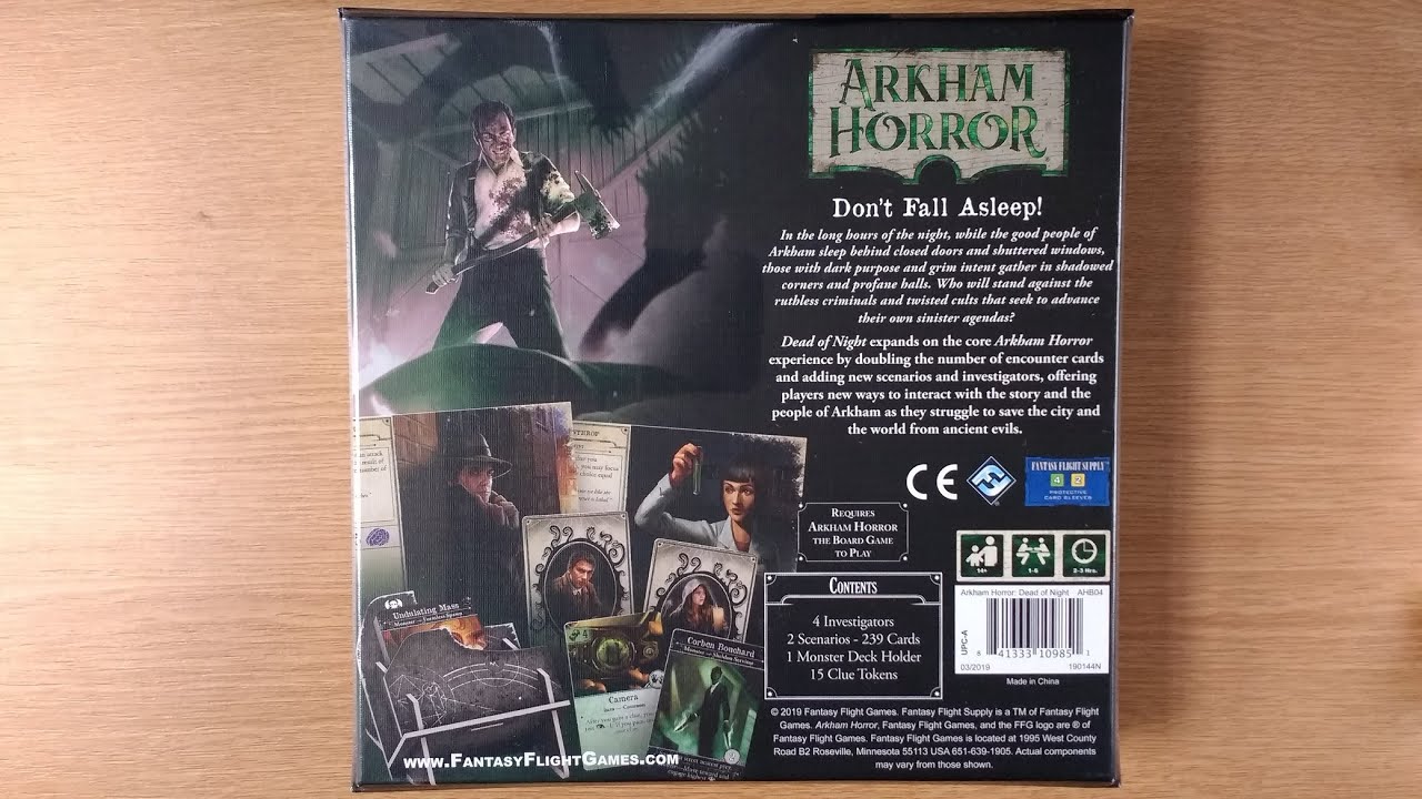 In Dead of Night, investigators explore the facets of Arkham best left unseen in the light of day. Organized crime builds a strong foothold in the city, secret cults labor for a dark master, an alien moon hangs overhead, and unknowable horrors stalk the night. is expansion includes two all-new scenarios, new encounters for every location in Arkham, new monsters and anomalies, and four new investigators to face these fresh horrors, armed with new spells, items and allies.