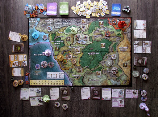Each player issues commands to his or her giants in the form of command cards (recruit, move, attack, pillage, and so on). This allows players to recruit new giants, send them out to attack settlements and other giants, and also to pursue special agendas based upon their race. Each player represents a different giant race (hill giants, stone giants, frost giants, fire giants, cloud giants, or storm giants), each with a different agenda. For example, the Storm Giants seek to restore their lost monarch, King Hekaton. The Cloud Giants seek an ancient dragon treasure trove, and the Hill Giants seek an abundance of food with which to feed their massive monarch, Chief Guh.