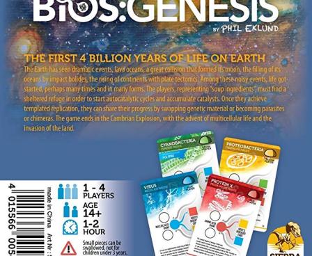 In Bios: Genesis, one to four players start as organic compounds shortly after Earth's formation, represented by up to three Biont tokens. The Amino Acids command Metabolism, the lipids create cells, the pigments control energy absorption and storage, and the nucleic acids control templated replication. Their goal is a double origin of life: first as Autocatalytic Life (a metabolic cycle reproducing, yet not replicating, its own constituents), and the second as Darwinian Life (an Organism using a template to replicate in an RNA world). Players can play cooperative, competitive, or solitaire.