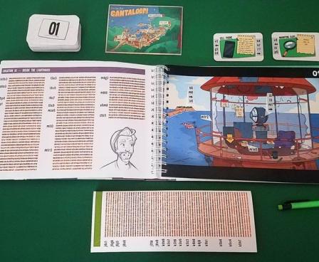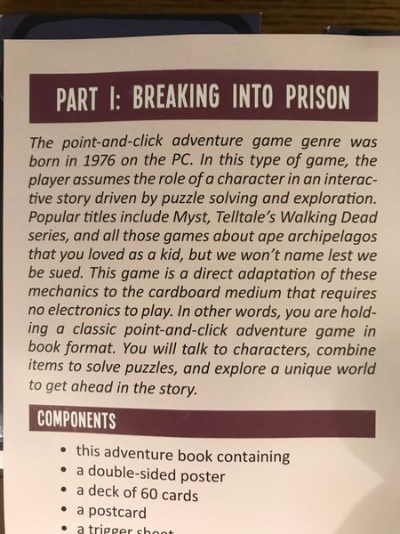 The point-and-click adventure game genre was born in 1976 on the PC. In this type of game, the player assumes the role of a character in an interactive story driven by puzzle solving and exploration. This game is a direct adaption of these mechanics to the cardboard medium that requires no electronics to play. In other words, you are holding a classic point-and-click adventure game in book format. You will talk to characters, combine items to solve puzzles, and explore a unique world to get ahead in the story.