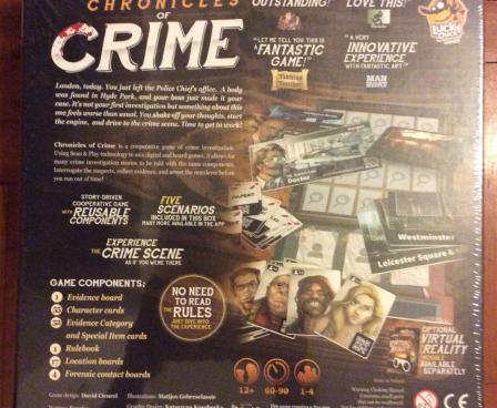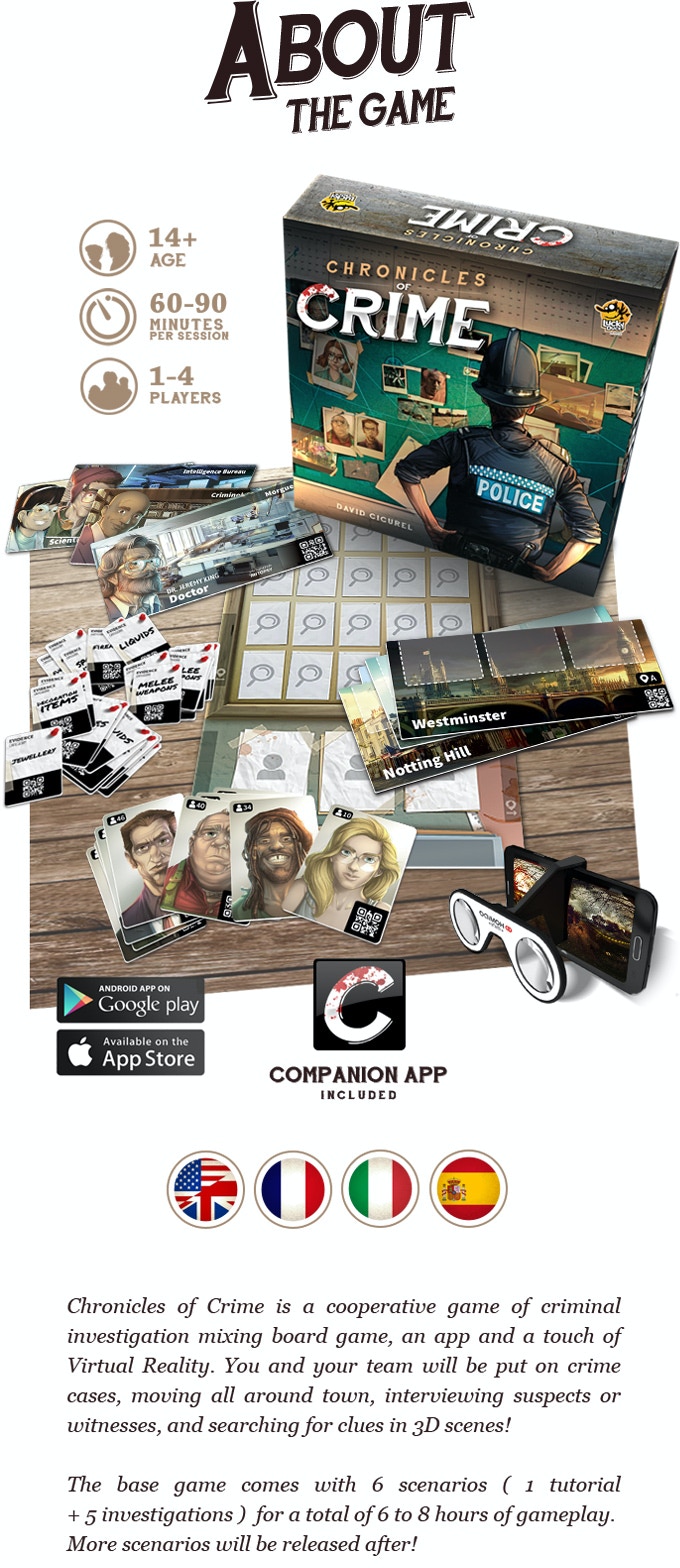 Chronicles of Crime is a cooperative game of crime investigation, mixing an app, a board game and a touch of Virtual Reality.