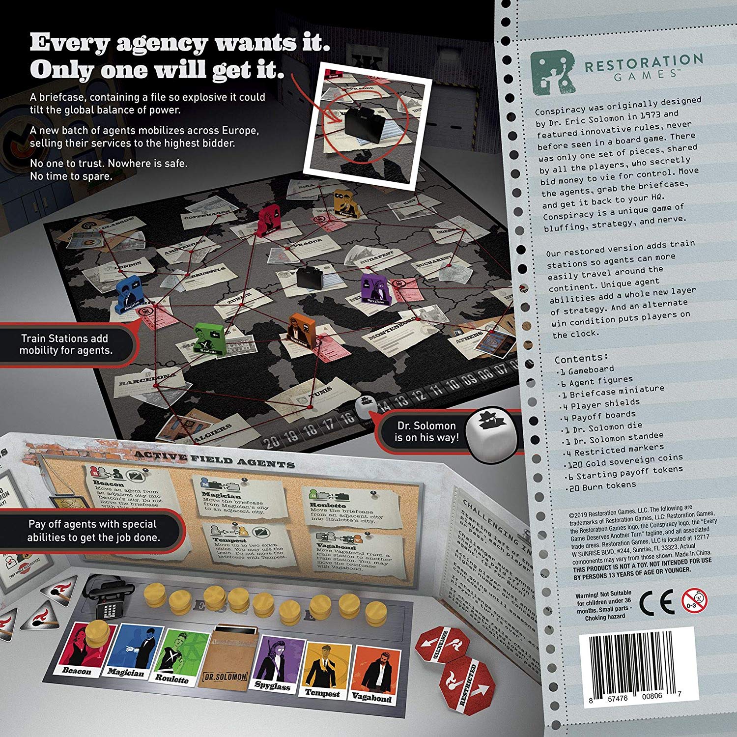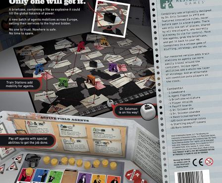 In Conspiracy: The Solomon Gambit, a restoration of the 1973 classic game Conspiracy, players vie for control of the agents by secretly paying them off and using them to move the briefcase across Europe, trying to get it to their HQ. But other players can challenge and stop an agent from moving if they have paid more than you — and for the right price they can even assassinate another agent.