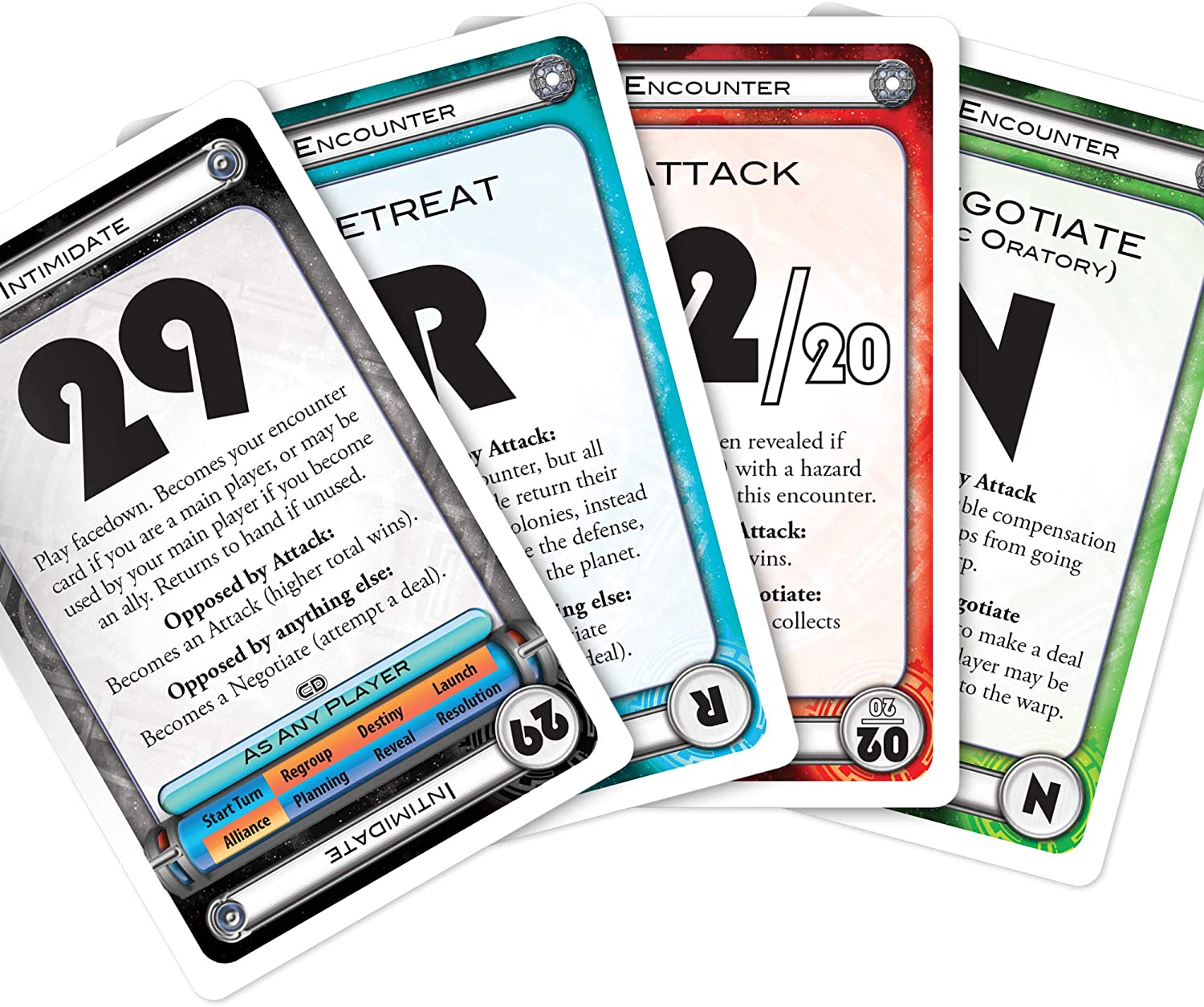 Consisting of two types (temporary and permanent), these cards have a variety of wild effects. The Energy Fields hazard card, for example, lets each main player draw two free cards... but they must show them to the group first. And the optional “Extremely Hazardous Variant” will take you on a wild ride; it brings a new hazard card into play every turn!