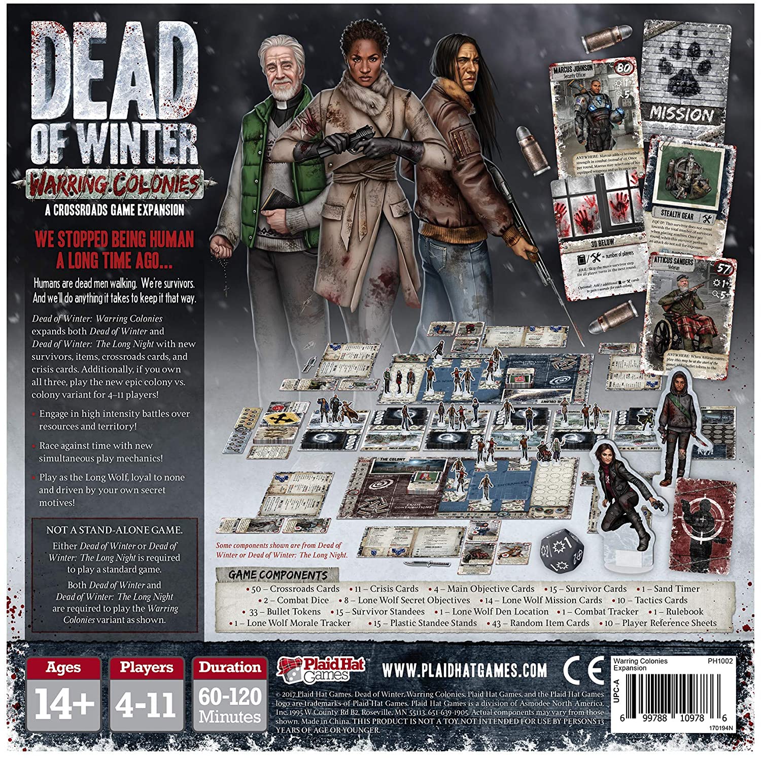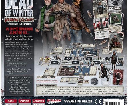 The Dead of Winter: Warring Colonies expansion includes 15 new survivors, 50 new crossroad cards, 43 new items, and 11 new crisis cards, many of which can be used with either Dead of Winter base set. However, to play either the warring colonies variant or the lone wolf module, you need both Dead of Winter: A Crossroads Game and Dead of Winter: The Long Night.