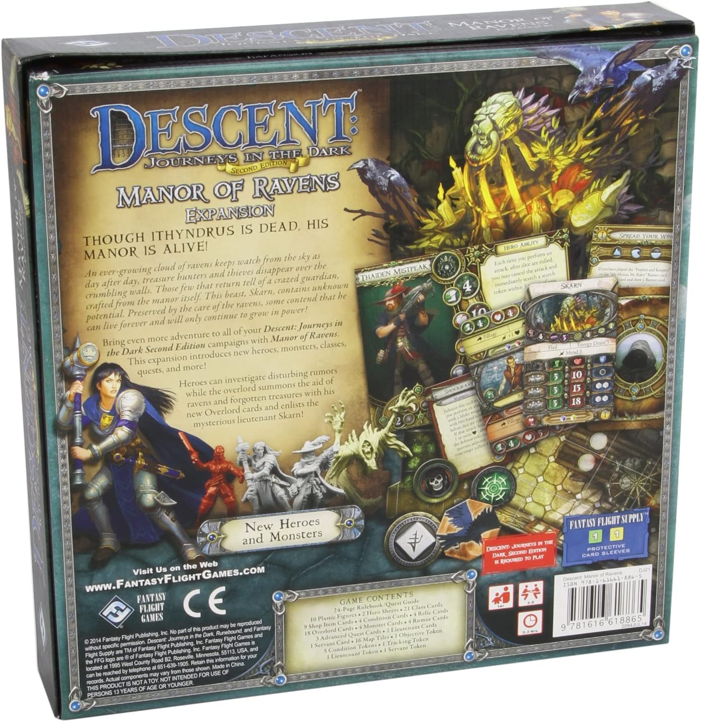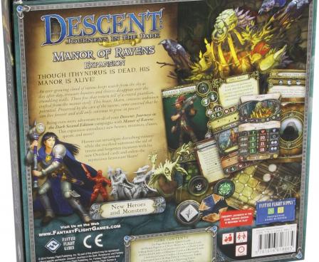 Manor of Ravens, an expansion for Descent: Journeys in the Dark (Second Edition), invites you to travel to a haunted manor house and battle the guardian that waits within. The overlord gains a host of new material in this expansion, including two new classes of Overlord cards, new monsters, and deadly new relics that can be wielded by monsters. The overlord even gains his first servant: a creature that can be summoned into play, similar to the heroes' familiar. The heroes also receive powerful new assets in Manor of Ravens, gaining access to two new heroes as well as new hero classes for Warriors and Scouts.