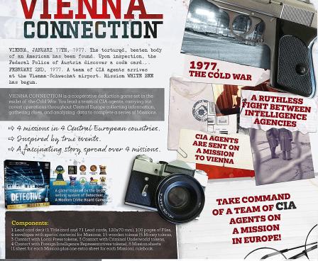 Vienna Connection is a standalone game inspired by the game mechanisms of Detective: A Modern Crime Board Game. In this game, players take on the roles of CIA agents sent to Europe in 1977 during the Cold War to investigate the mysterious death of James Werner, an American citizen murdered in Vienna.