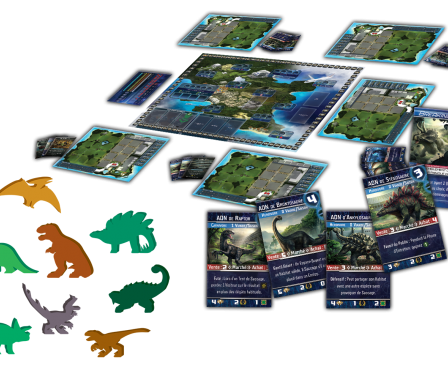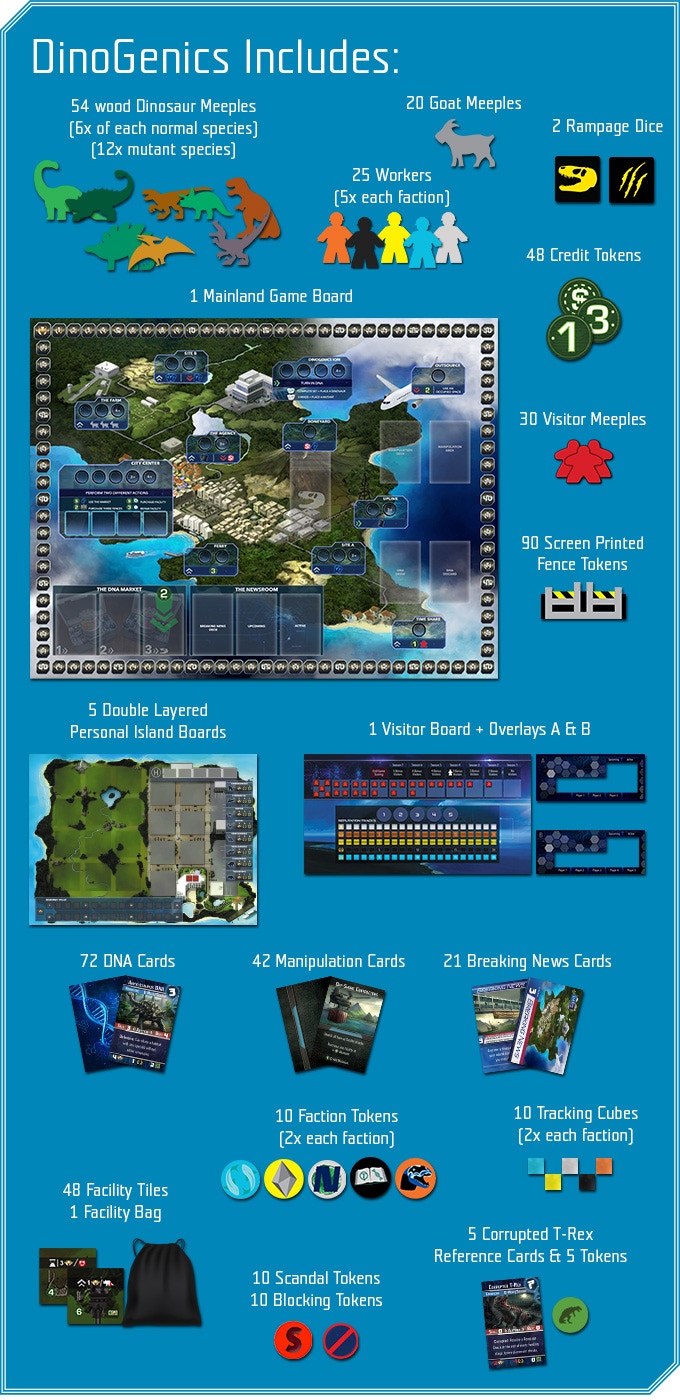 DinoGenics is a competitive game for two to five players, in which each player attempts to build and run their own successful dinosaur park.