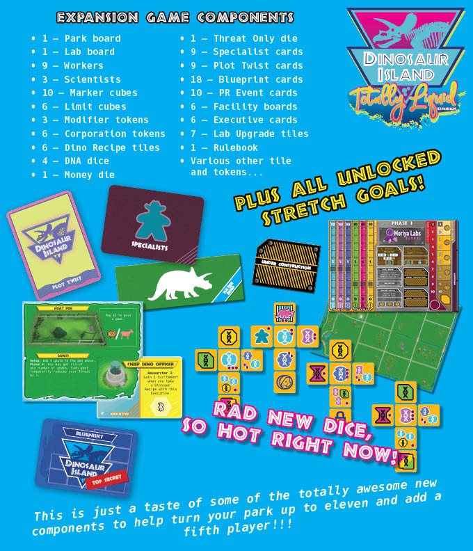 Dinosaur Island: Totally Liquid adds components needed to play Dinosaur Island with up to five players, in addition to adding water dinosaurs to the base game, new parkboard extensions, executive worker meeples that give unique worker abilities to each player, a blueprints module that rewards players when they build certain park layouts, PR events that create hidden scoring opportunities, and more.
