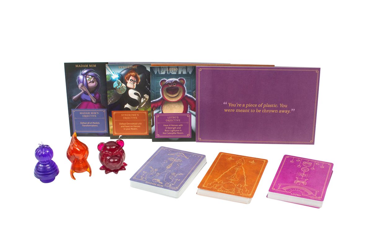 In more detail, just like in The Incredibles, Syndrome will face off against Frozone and the Parr family, using his minions and advanced technology to come out ahead. To win as Syndrome, players need to upgrade the Omnidroid, then defeat it and all heroes in his realm. Lotso seeks to control Sunnyside Daycare by reducing four heroes' strength (utilizing a game mechanism new to Disney Villainous) and moving those heroes to the toddlers' Caterpillar Room. Finally, those playing as Madam Mim will need to win a wizard's duel against Merlin, using Mim's Transformations to defeat Merlin's.