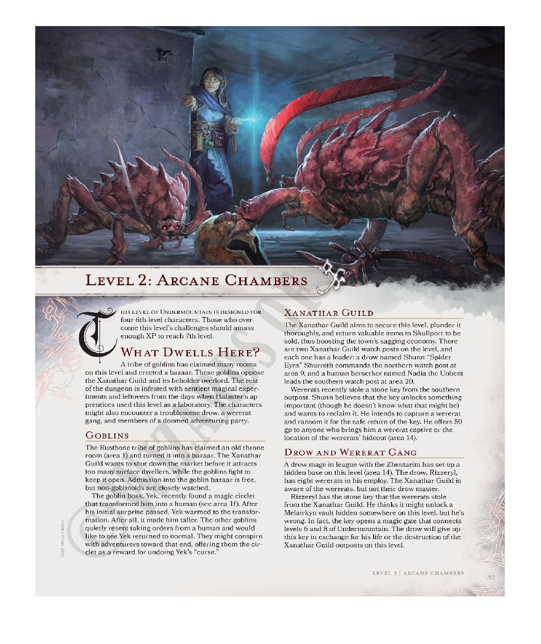 In the city of Waterdeep rests a tavern called the Yawning Portal, named after the gaping pit in its common room. At the bottom of this crumbling shaft is a labyrinthine dungeon shunned by all but the most daring adventurers. Known as Undermountain, this dungeon is the domain of the mad wizard Halaster Blackcloak. Long has the Mad Mage dwelt in these forlorn depths, seeding his lair with monsters, traps, and mysteries—to what end is a constant source of speculation and concern.