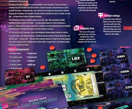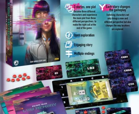 Escape Tales: Low Memory is a story driven escape room in card game form, with immersive exploration, no time limits when solving puzzles, and a collection of tough choices that will captivate and draw you deeply into a riveting story of a cyberpunk future. Low Memory is the next title in the Escape Tales product line — a standalone story that can be played and enjoyed without previous ownership of or familiarity with Escape Tales: The Awakening. All you need for a full, satisfying, narrative, and challenging experience is already here!