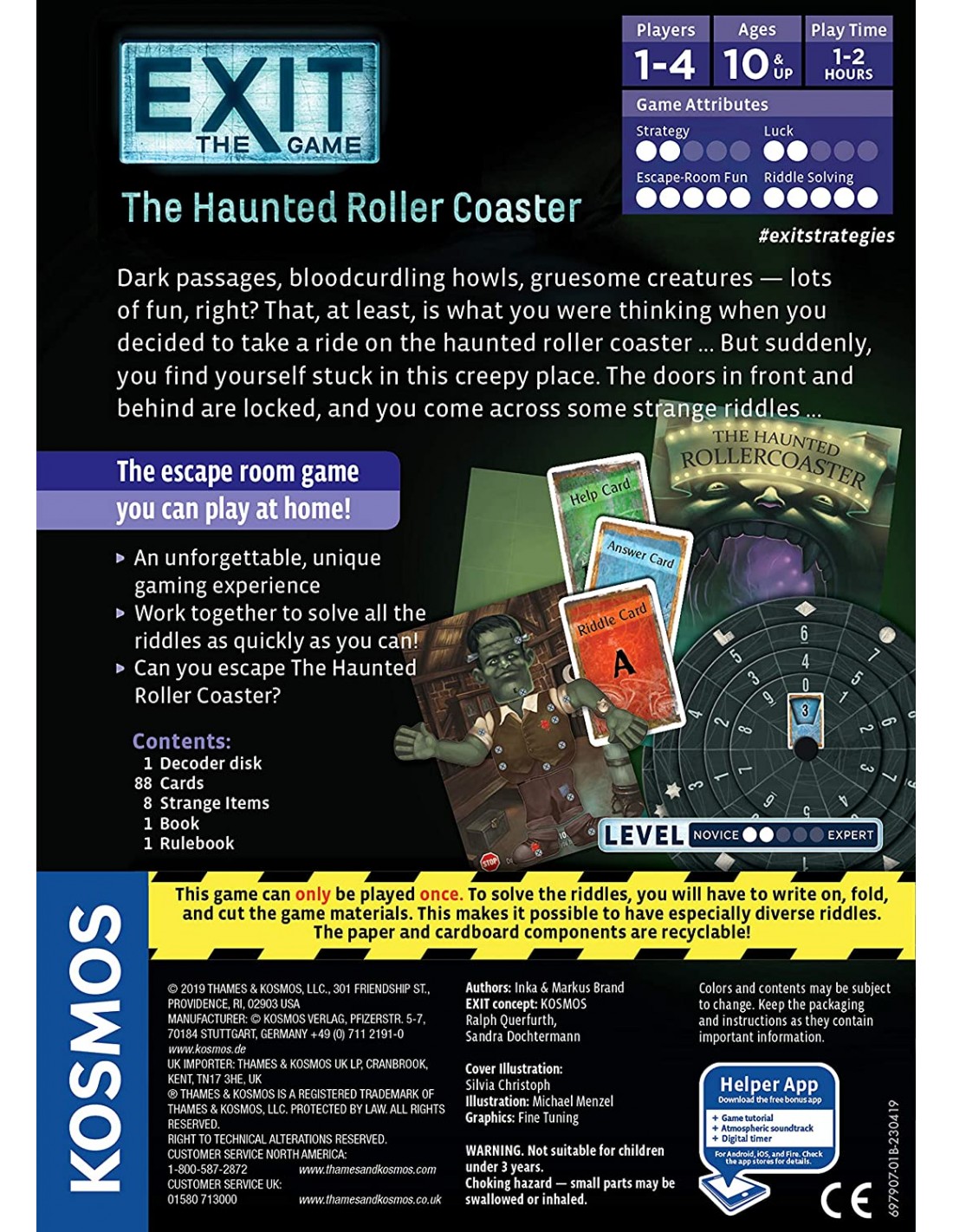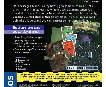 Like other titles in the series, Exit: The Game – The Haunted Roller Coaster includes components meant to be folded, written upon, or torn, so it's marketed as a single-use game.