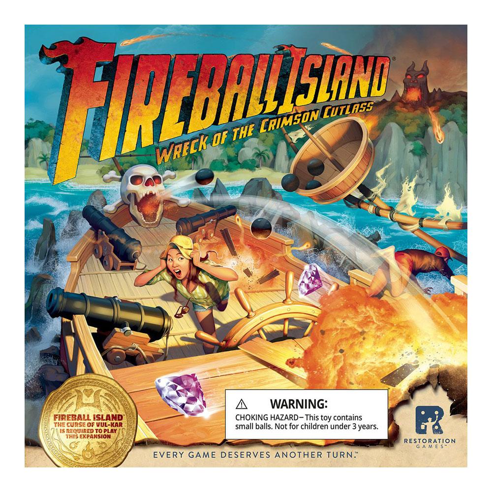 Wreck of the Crimson Cutlass introduces a new play area to Fireball Island: The Curse of Vul-Kar. The ship features new treasures to collect and introduces new action cards with more of a take-that feel. On the ship, you'll face two new threats. The crow's nest collect marbles until it suddenly tips over, spilling them all over the deck of the ship. The jolly roger in the bow launches a single marble toward anyone foolish enough to take the captain's wheel.