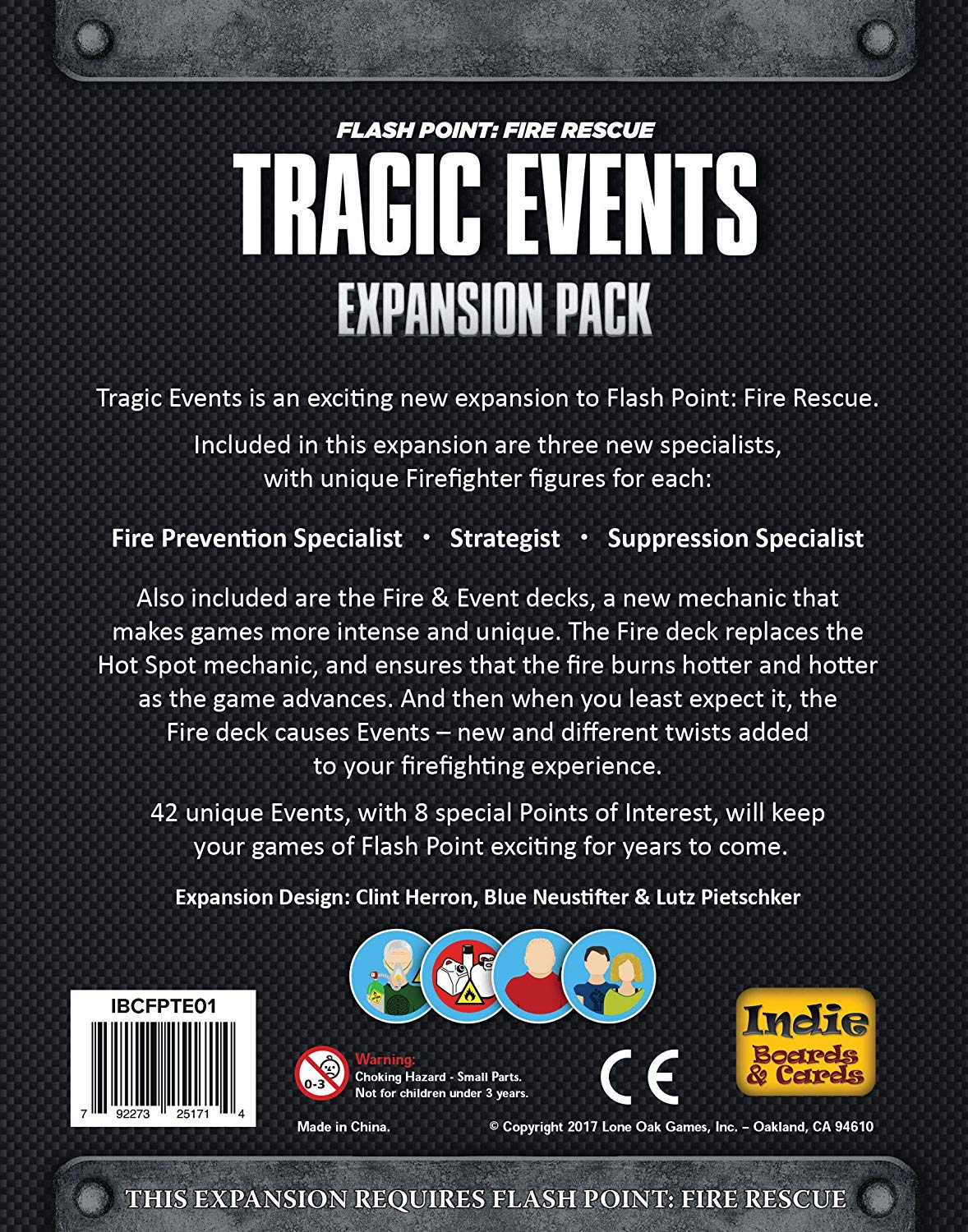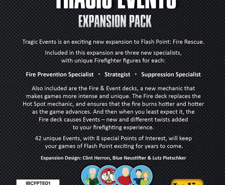 Tragic Events includes the Fire & Event decks that are designed to replace the Hot Spot mechanic in the Experienced game rules and add exciting new "events" to make each game of Flash Point even more unique. This expansion also includes three specialists, each with their own mini: Strategist, Suppression Specialist, and Fire Prevention Specialist.