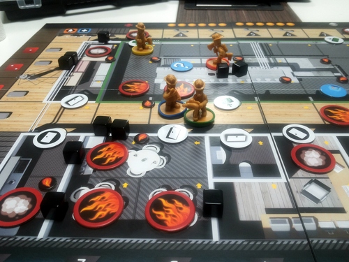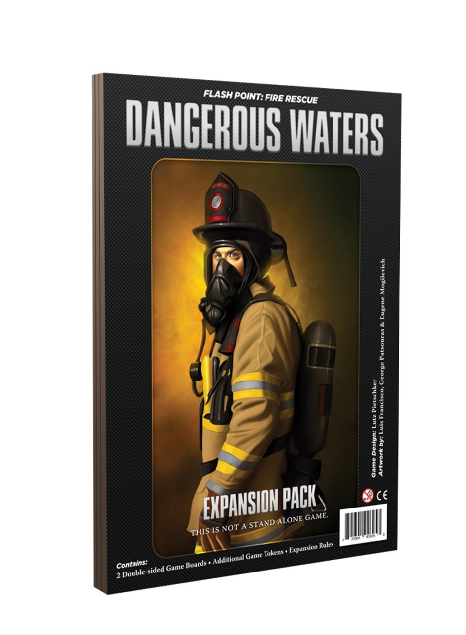 This expansion for Flash Point: Fire Rescue includes two double-sided half boards (similar to those in the 2nd Story expansion) that represent a ship on one side and a part of a submarine on the other. The interior of the ship features an engine room, cabins and heat-conducting steel walls on a 6x8 game board, while the submarine is an elongated 3x16 game board that features victims who can't just leap out of a window to safety and who might be in danger even within the sick bay.
