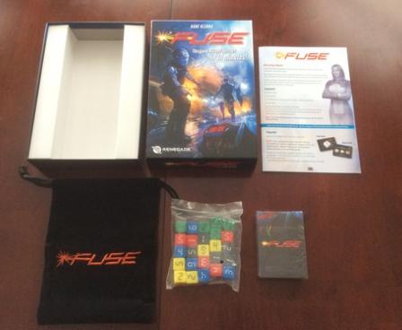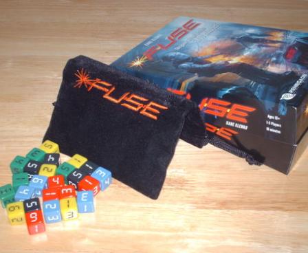 FUSE is a real-time co-operative game that employs 25 dice and 65 cards. Each game is set to a ten-minute timer, and players must work together in that ten minutes to defuse all of the bombs. Each bomb is represented by a card which needs a certain combination of dice in order to defuse it. A player will draw a number of dice equal to the number of players out of a bag and roll them. Players must then decide who will get which dice, but each player must take one and only one.